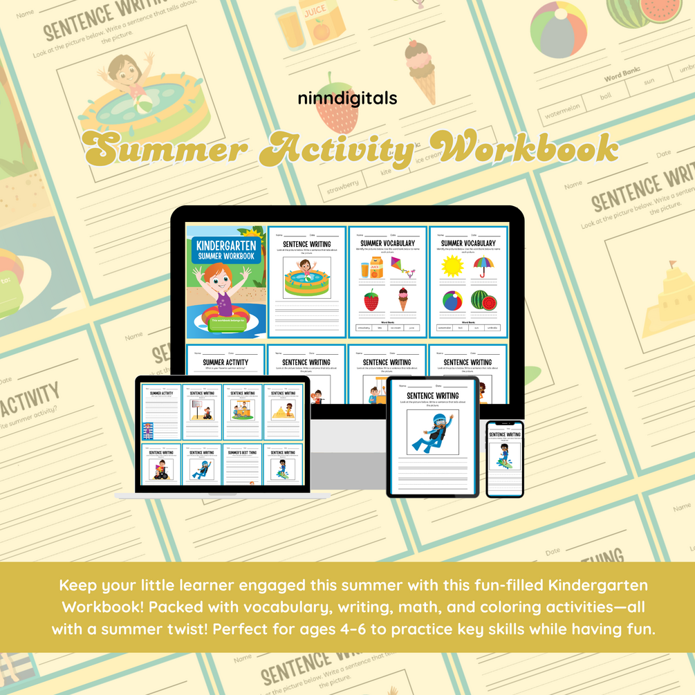 You'll get a 25+ page summer-themed workbook designed for kindergarteners to boost literacy, math, and creativity. From sentence writing and counting games to coloring and fun graphing, it’s a playful way to keep your child learning all summer long! Just print and play!